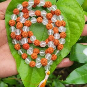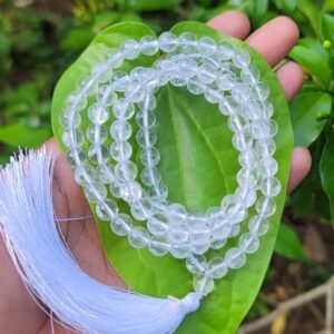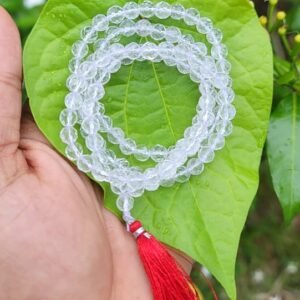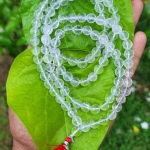 Spatika Mala” is a term from Hinduism, specifically associated with the worship of Lord Shiva. It refers to a rosary (mala) made of crystal (spatika), also known as a crystal mala. In Hindu culture, using a spatika mala for chanting mantras or prayers is believed to have spiritual significance and can enhance focus and concentration during meditation or devotional practices. Crystal is considered to have purifying properties and is believed to amplify the intentions of the user during meditation or prayer.