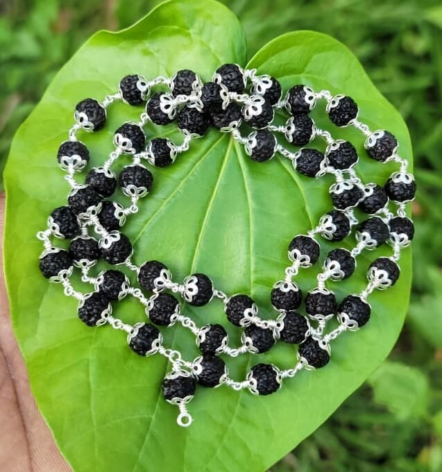 Black Rudraksha Silver(925) Flower Cap Mala-8mm 54 beads